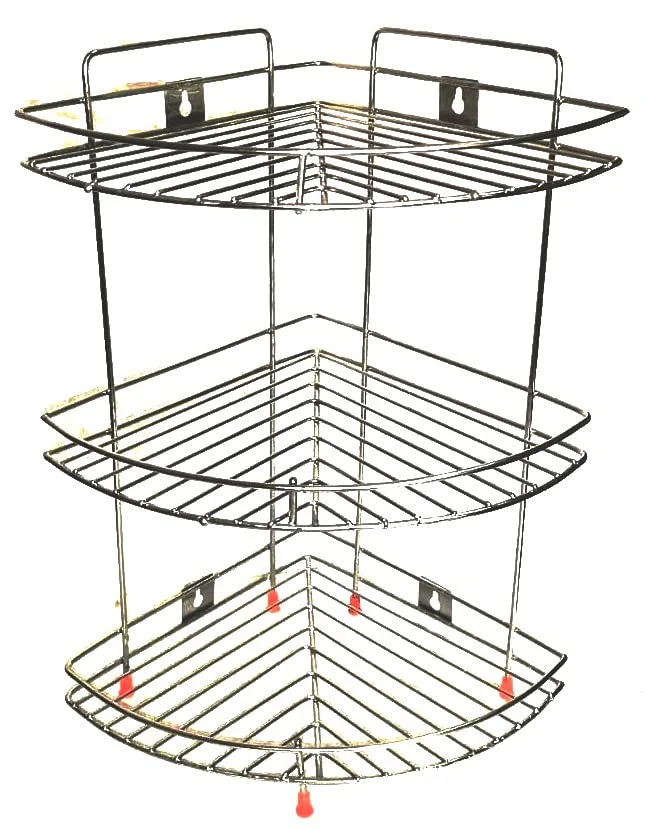 Stainless steel 3 shelf corner rack with 3 tier storage for kitchen, bathroom and home organization. Durable rust resistant corner storage rack.