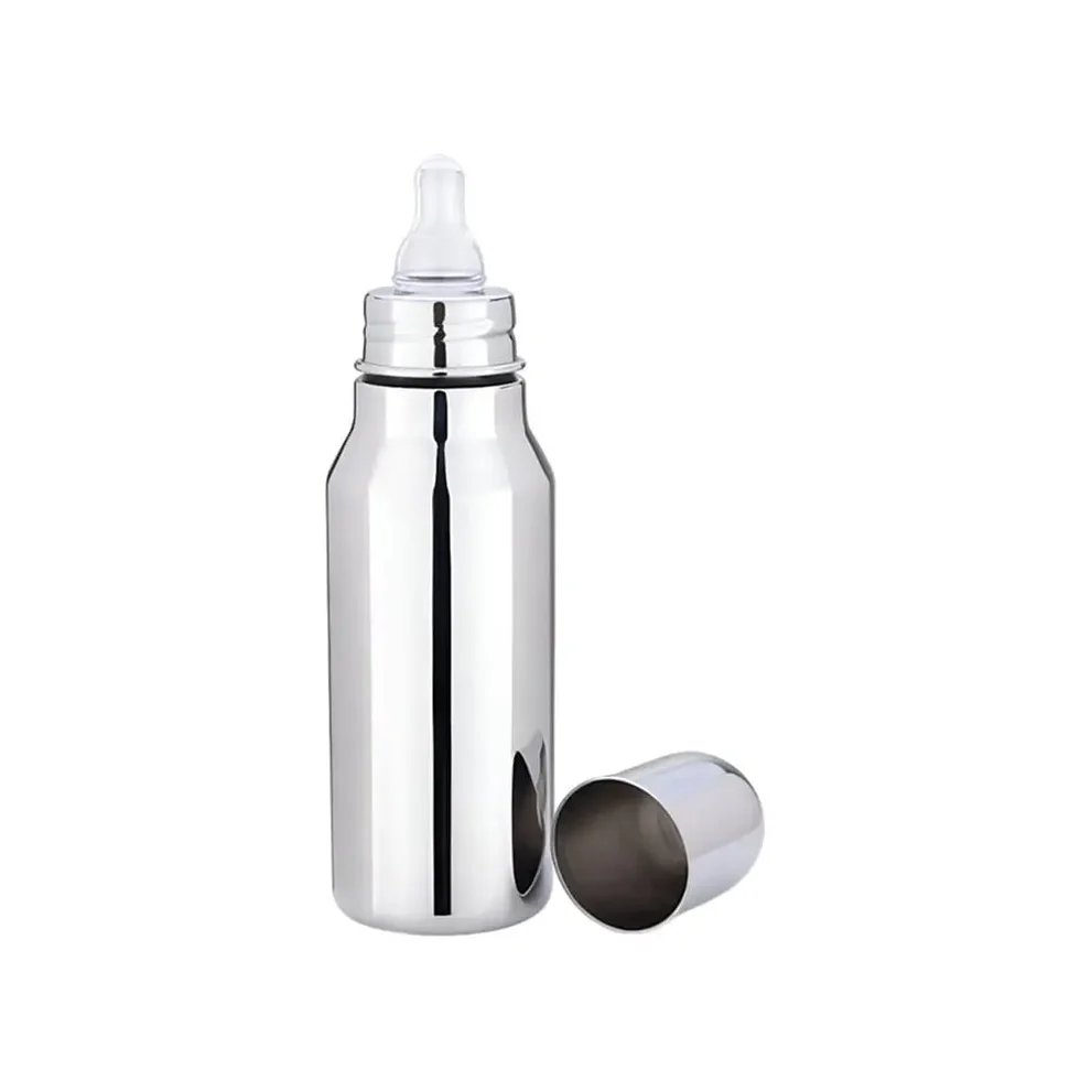 The stainless steel baby feeding bottle comes with a medically tested 100% food-grade silicone nipple, providing a safe and comfortable feeding experience for infants. The bottle is easy to maintain and clean—only the silicone nipple needs sterilization, while the bottle itself can be washed easily with soap and water.