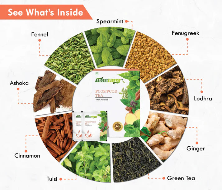 Balance your hormones naturally with Freshville PCOS & PCOD Tea Bags, a caffeine-free herbal blend carefully crafted for women’s wellness. Made with Ginger, Fenugreek, Spearmint, Cinnamon, Fennel, Tulsi, Lodhra, and Ashoka, this tea supports menstrual cycle regulation, helps manage PCOS/PCOD symptoms, and promotes skin and hair health.