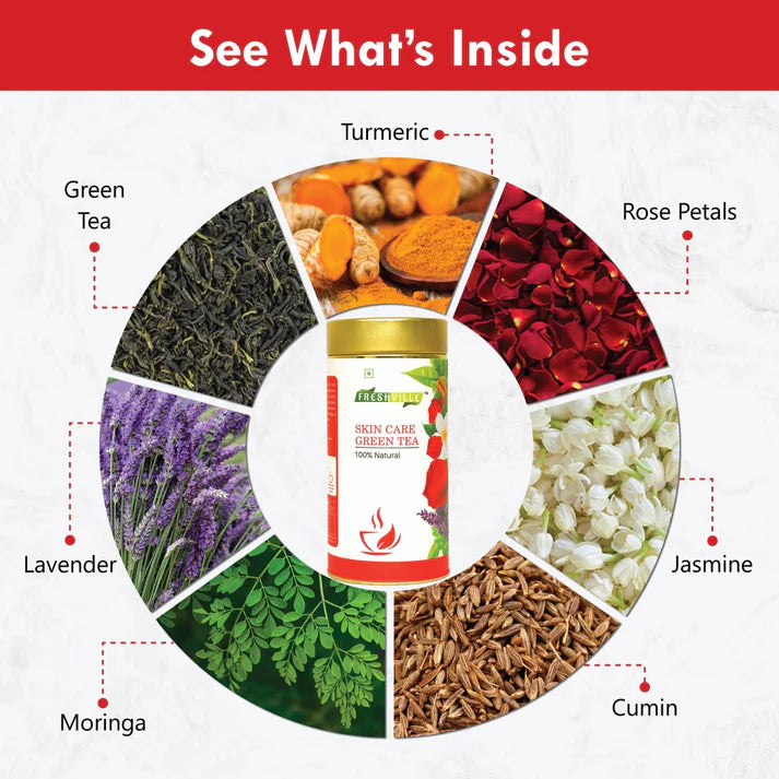 • Key Ingredients: Turmeric, Cumin, Lavender, Rose Petals, Jasmine, Moringa, Green Tea