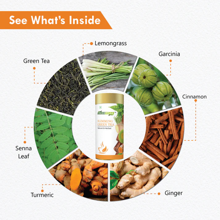Achieve your fitness goals naturally with Freshville Slimming Green Tea. This refreshing blend combines Garcinia, Cinnamon, Ginger, Lemongrass, Turmeric, Senna Leaf, and Green Tea to help support weight management, boost metabolism, and promote fat burning. Packed with antioxidants and natural herbs, it aids digestion, detoxifies the body, and energizes your daily routine.